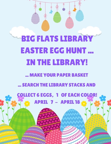 Egg Hunt in The Library! Build a paper basket and then search high and low in the stacks for each color egg! Available each day during regular hours between 4/7-4/18. Happy Spring!