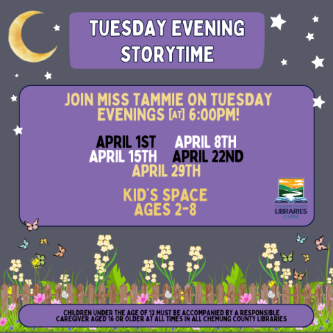 Join Miss Tammie for storytime on Tuesday evenings through April!