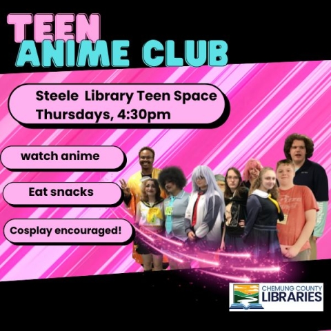 This event is in the "Teens" group Steele Teen Anime Club Thursday, December 18, 2025 at 4:30pm - 5:15pm Teen Space at Steele Memorial Library Program Type: Games & Hobbies, Movies & TV / Performances Age Group: Teens 7th-12th graders watch, discuss anime and eat snacks. Cosplay encouraged. Hang out, bring a friend! View Details