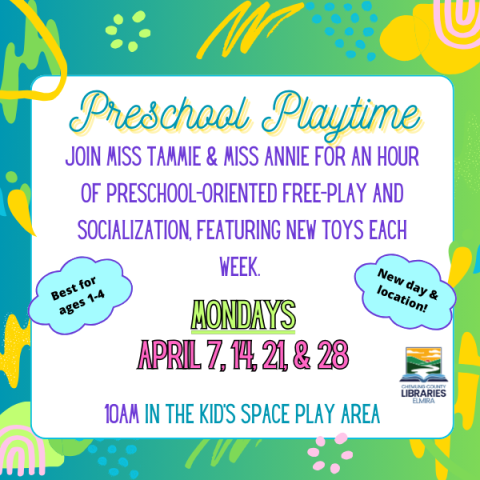 This event is in the "Babies & Toddlers" group Steele Kids: Preschool Playtime Monday, December 22, 2025 at 10:00am - 11:00am Kid's Space Play Area at Steele Memorial Library Program Type: Self-directed Activities & Kits, Storytimes Age Group: Babies & Toddlers Join Miss Haley for an hour of preschool-oriented free-play and socialization, featuring new toys each week. Mondays, December 1, 8, 15, 22, & 29 @ 10am in the Kid's Space. View Details