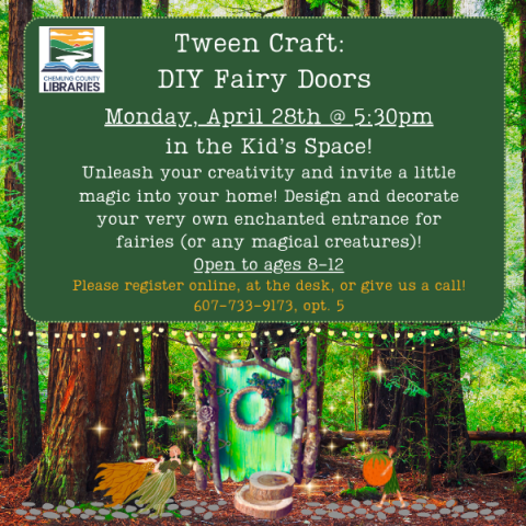 Elmira Area Writers' Group Tuesday, December 23, 2025 at 6:00pm - 7:30pm Small Conference Room at Steele Memorial Library Purpose of Reservation: Meet up with other creatives with the Elmira Area Writers' Group!